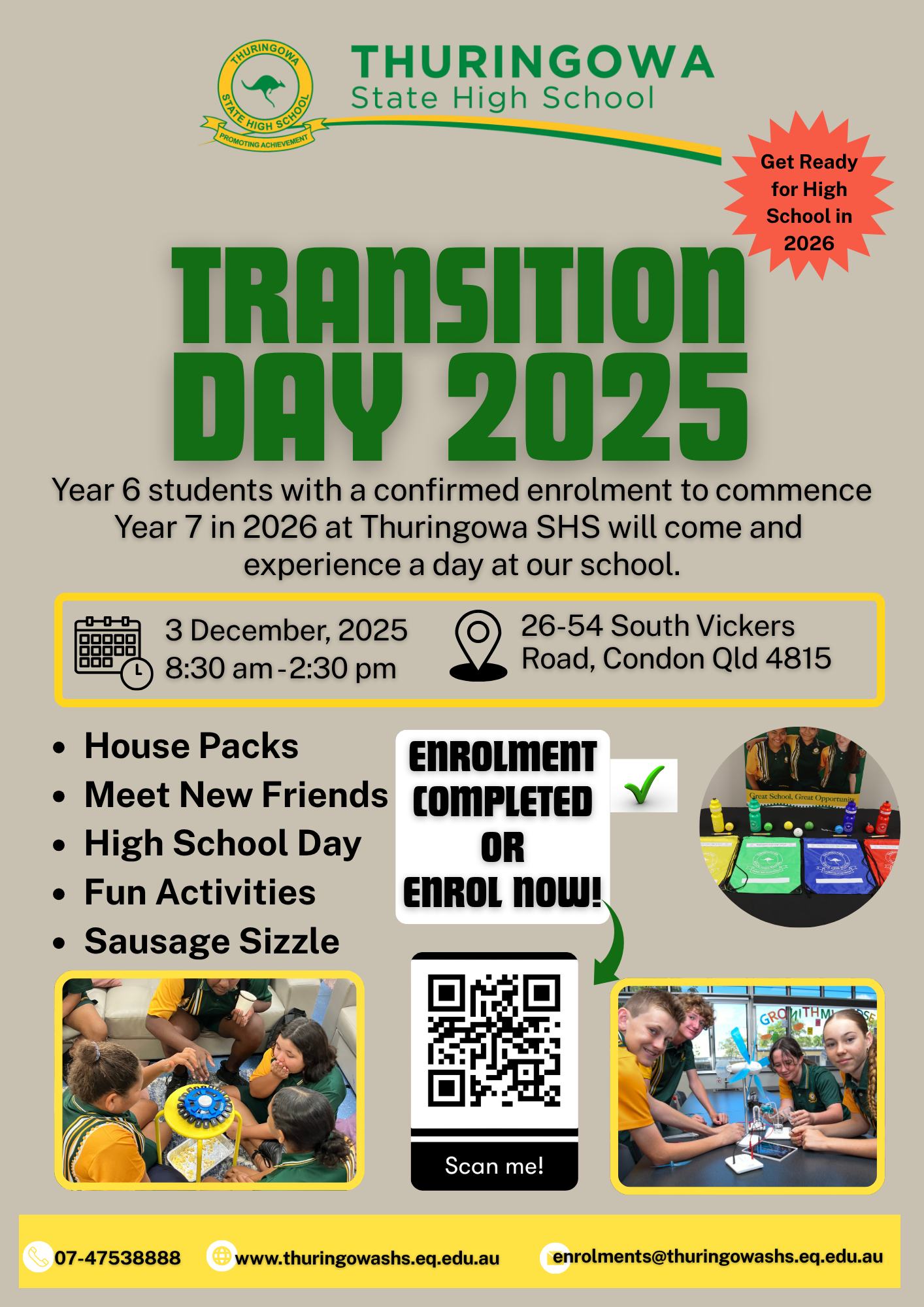 Our year 6 students graduate at the end of the year and head off to high school. There are a number of state high schools in the Townsville region and they coordinate a single transition day where year 6 students with a completed enrolment can attend their chosen state high school for the entire day. Each school plans their own program. This year the State High Schools Transition day will be Wednesday 3 December.